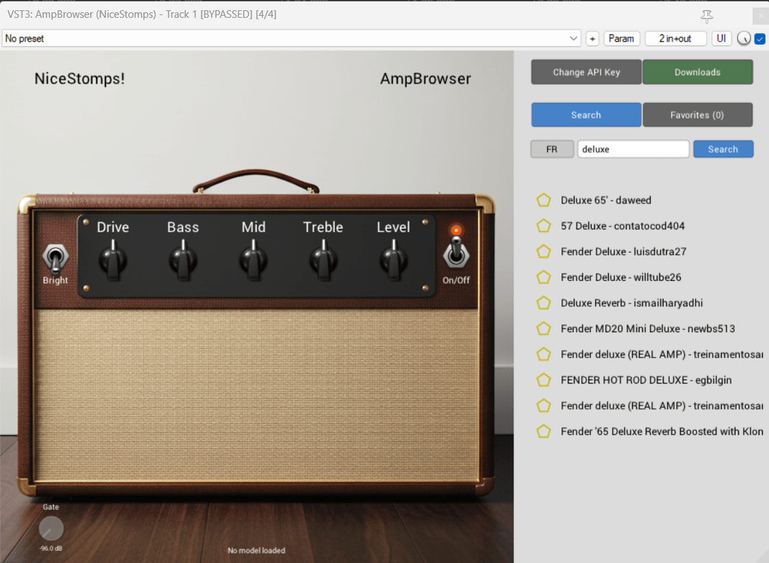 AmpBrowser brings thousands of free amplifier profiles directly into your DAW through an intuitive search-and-load interface. Powered by Neural Amp Modeler (NAM) technology and connected to the Tone3000 community library, you can instantly access classic and modern amps by simply searching by brand, model, or amp type. Choose between Full Rig (FR) profiles—where the speaker cabinet is baked into the capture—or DI amp profiles, which let you use your own IR loader and cabinet impulses for complete tonal control. Each amp profile is captured using machine learning for authentic feel and response, and with built-in controls for Gain, EQ, Level, Gate, and Presence/Bright, you can dial in professional tones quickly without managing files or scrolling through endless preset folders. A free Tone3000 account is required for the plugin to function as intended. Please read the manual for setup and usage instructions. No more downloading individual profiles or digging through preset banks — just search, load, and play.